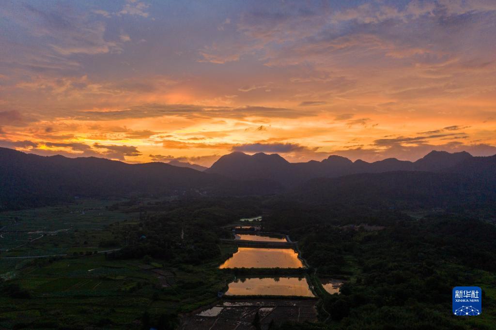 7月5日拍攝的晚霞籠罩下的浙江省建德市大慈巖鎮(無(wú)人機照片)。
