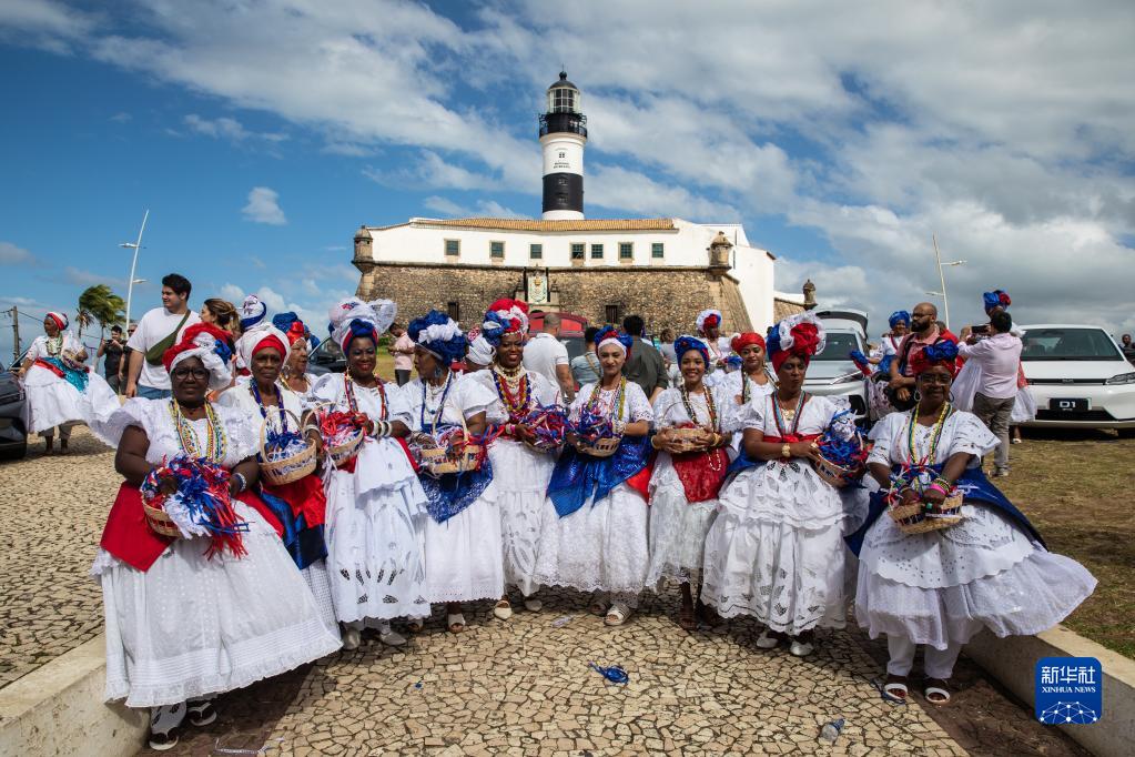 7月4日,在巴西巴伊亞州薩爾瓦多,身著(zhù)巴伊亞風(fēng)格服裝的女子站在巴伊亞航海博物館前。