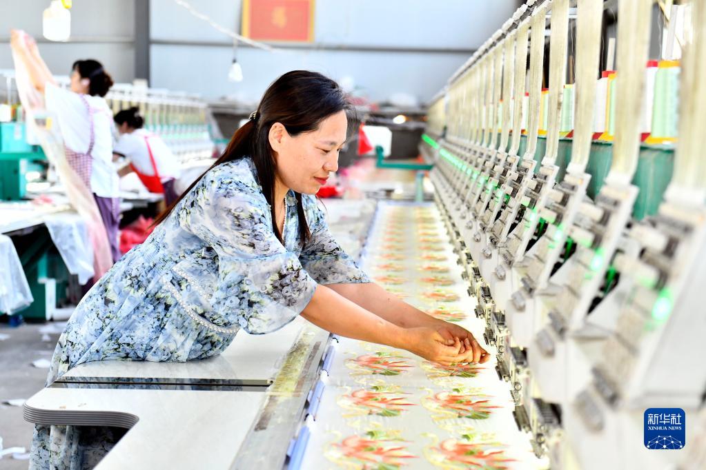 7月6日,在曹縣安蔡樓鎮李想繡花廠(chǎng),工作人員在繡花前接線(xiàn)。