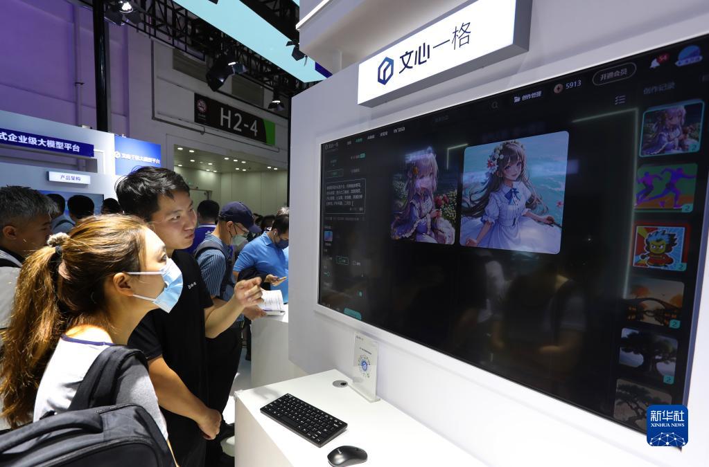 7月6日,工作人員在2023世界人工智能大會(huì )展會(huì )現場(chǎng)向參觀(guān)者介紹百度“文心一格”。