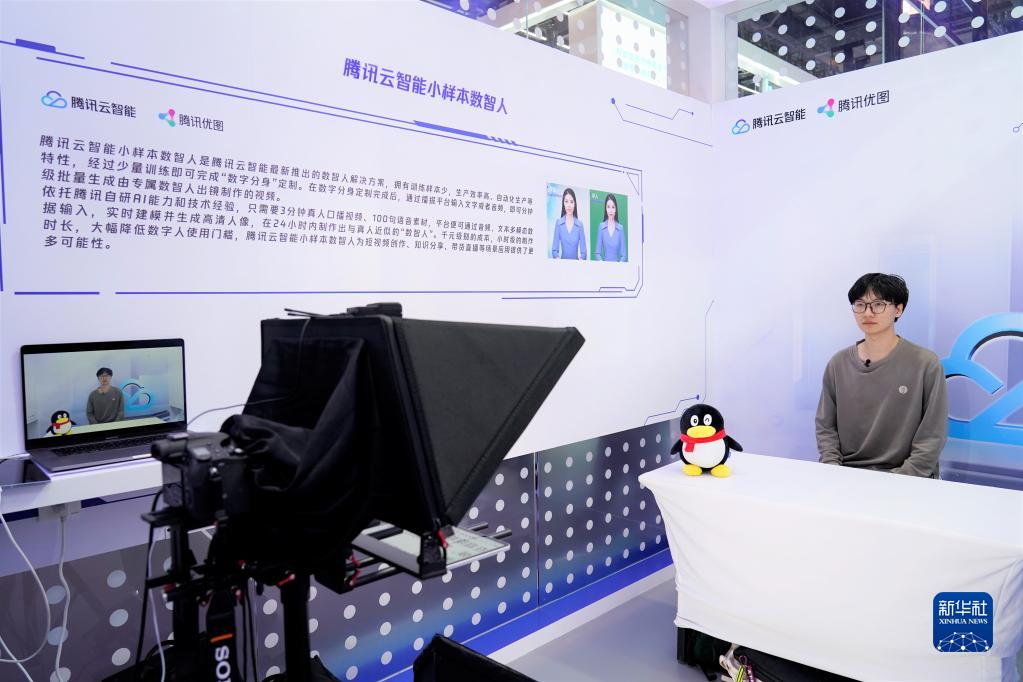 7月6日,參觀(guān)者在體驗騰訊云智能小樣本數智人錄制。