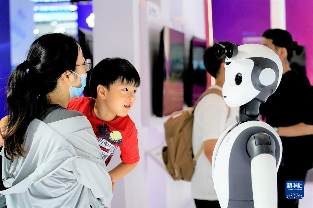 7月6日,參觀(guān)者在達闥展位與柔美人形智能服務(wù)機器人互動(dòng)。