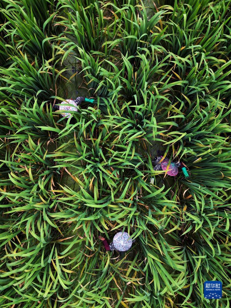 7月6日,蘆潼村的村民在采收茭白(無(wú)人機照片)。