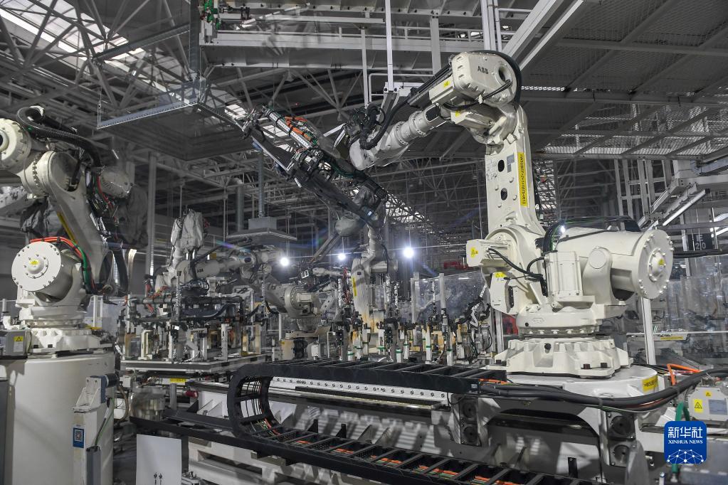 在位于吉林長(cháng)春的一汽紅旗繁榮工廠(chǎng)焊裝車(chē)間內,機器人焊裝車(chē)輛零部件(7月6日攝)。