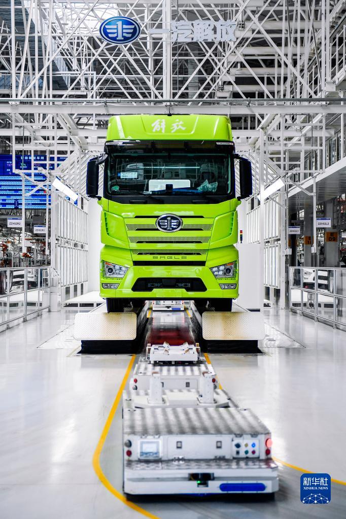 在位于吉林長(cháng)春的一汽解放J7智能工廠(chǎng)內,AGV搬運機器人將完成裝配的車(chē)輛運下生產(chǎn)線(xiàn)(6月27日攝)。