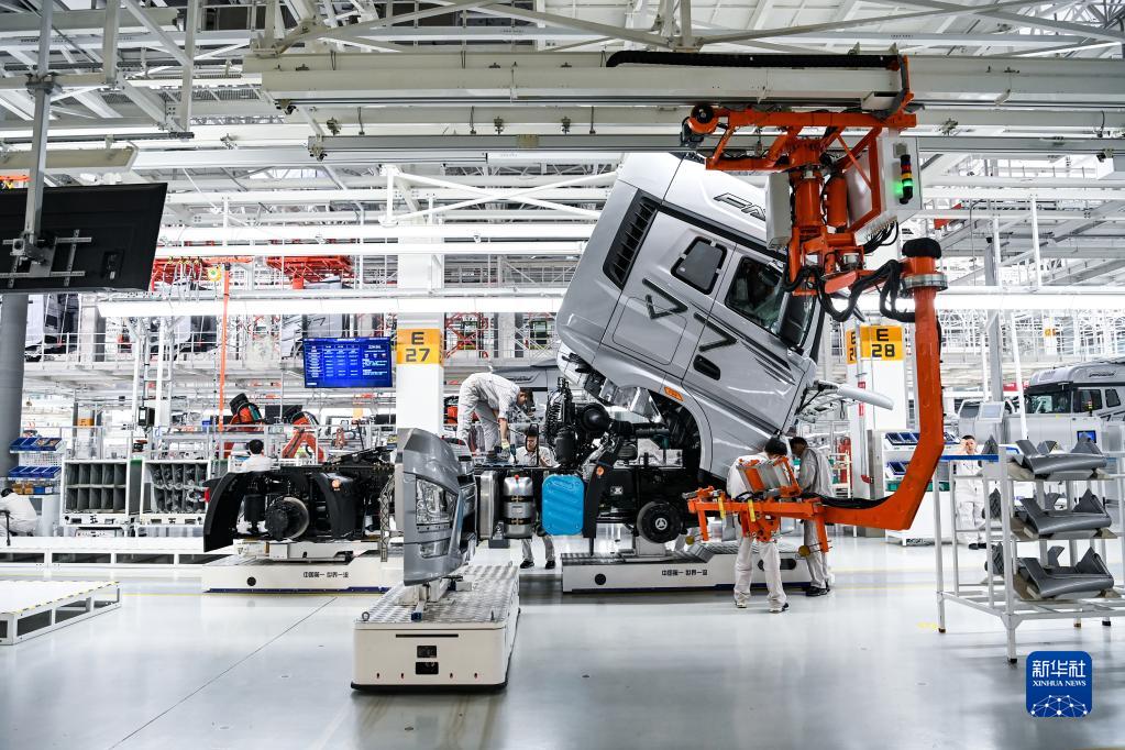 在位于吉林長(cháng)春的一汽解放汽車(chē)有限公司J7智能工廠(chǎng)內,工人在A(yíng)GV上裝配車(chē)輛(6月12日攝)。
