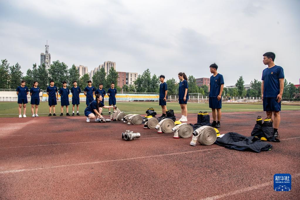 6月28日,熱依來(lái)·吉力力(右三)和同學(xué)在消防專(zhuān)業(yè)體能訓練課上。