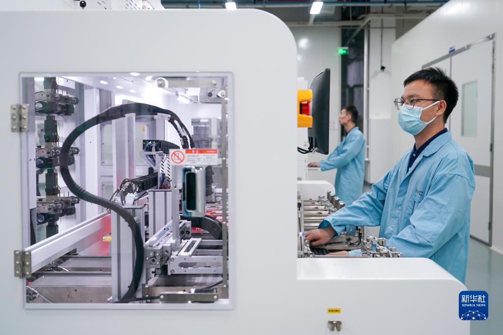 在位于蘇州工業(yè)園區的蘇州華興源創(chuàng )科技股份有限公司,工作人員在研發(fā)車(chē)間內操作先進(jìn)封裝芯片測試機(7月5日攝)。