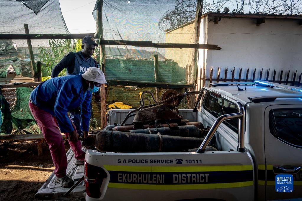 7月6日,警察在南非豪滕省埃庫爾胡萊尼市的事發(fā)現場(chǎng)轉移氣罐。