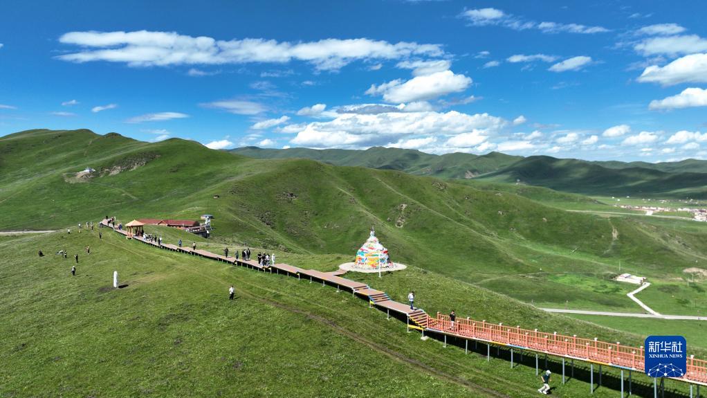 游客在甘南藏族自治州瑪曲縣阿萬(wàn)倉濕地的觀(guān)景步道上游覽(7月6日攝,無(wú)人機照片)。