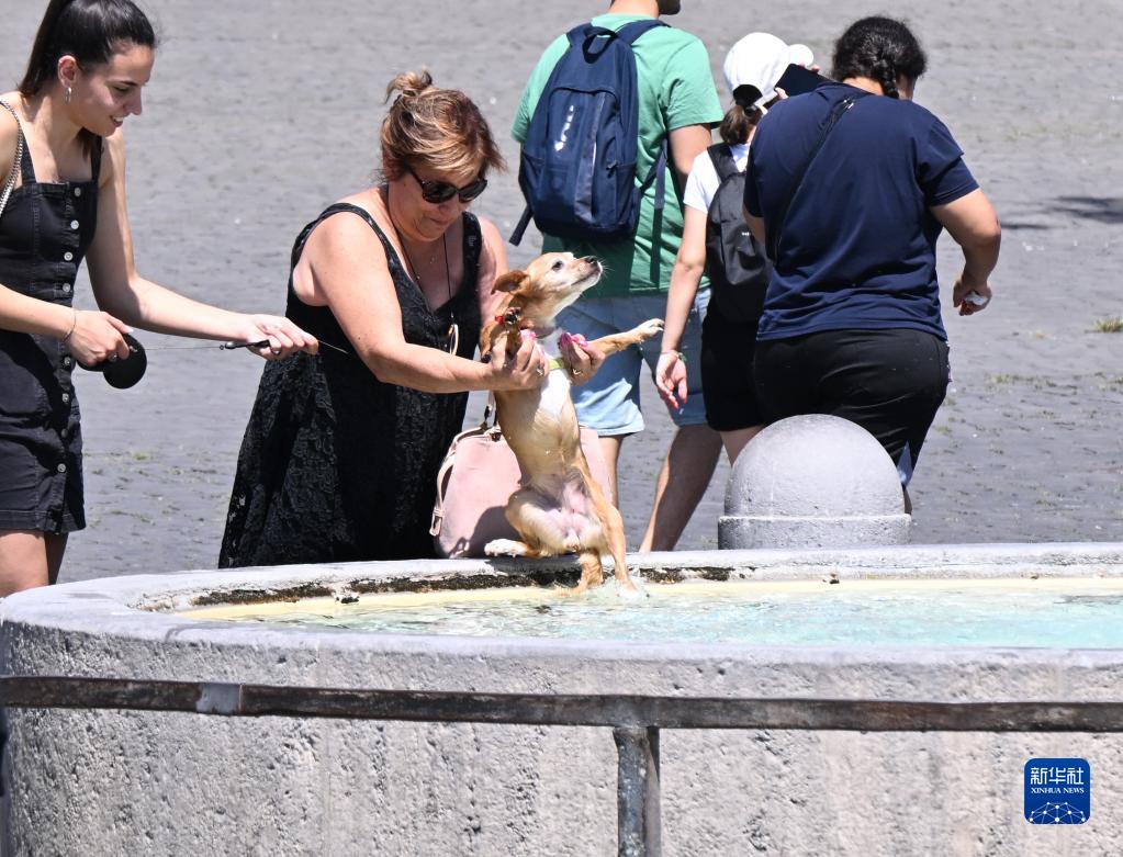 7月7日,一名女子在意大利羅馬人民廣場(chǎng)的一處噴泉幫自己的寵物狗沖涼。