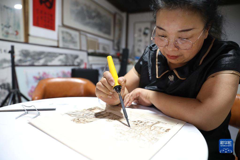 7月6日,李影在位于遼寧省營(yíng)口市大石橋的工作室里進(jìn)行木板烙畫(huà)創(chuàng )作。