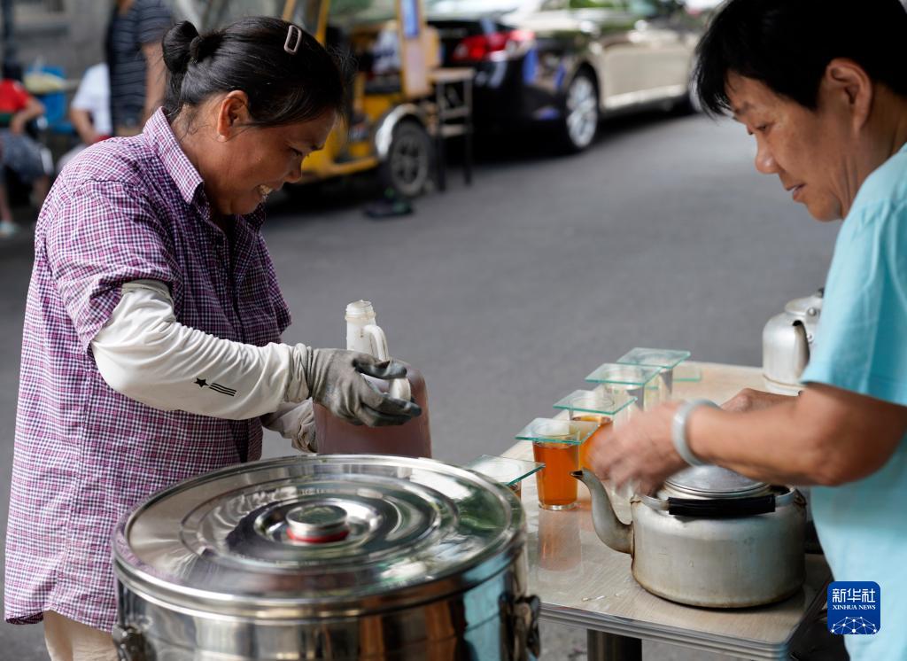 7月7日,一名戶(hù)外勞動(dòng)者(左)在杭州市濮家聯(lián)合社區愛(ài)心涼茶攤裝涼茶。