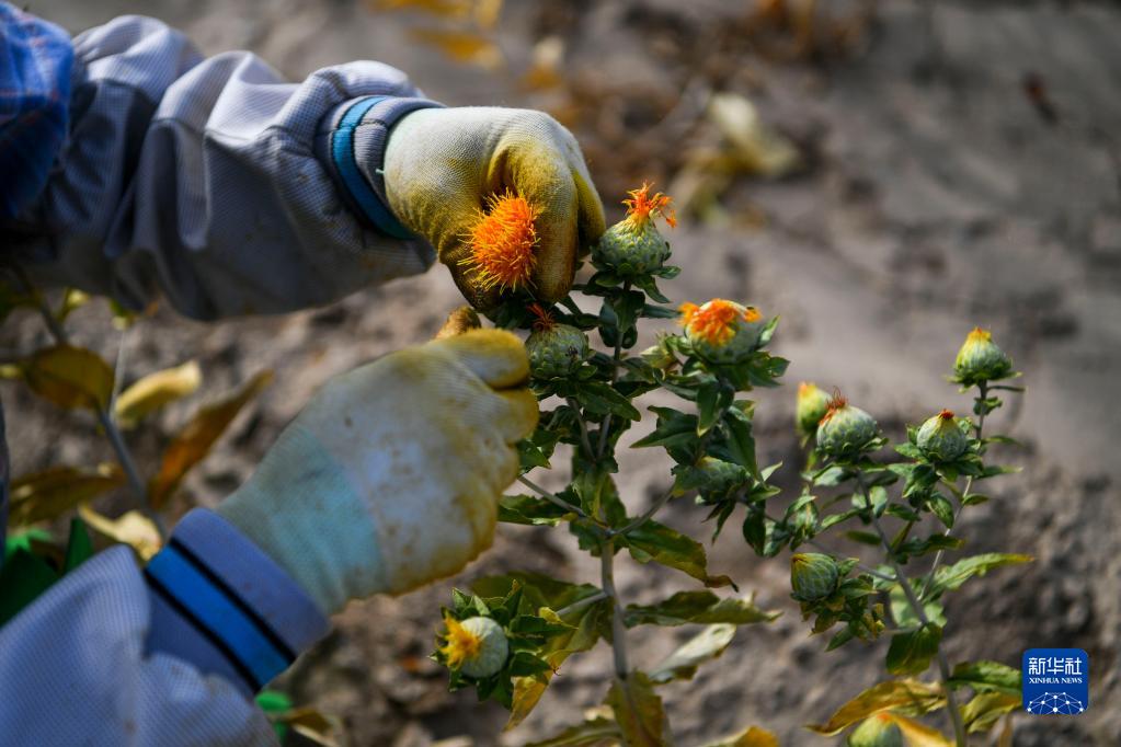 7月7日,采摘工人在新疆裕民縣江格斯鄉江格斯南村采收紅花絲。
