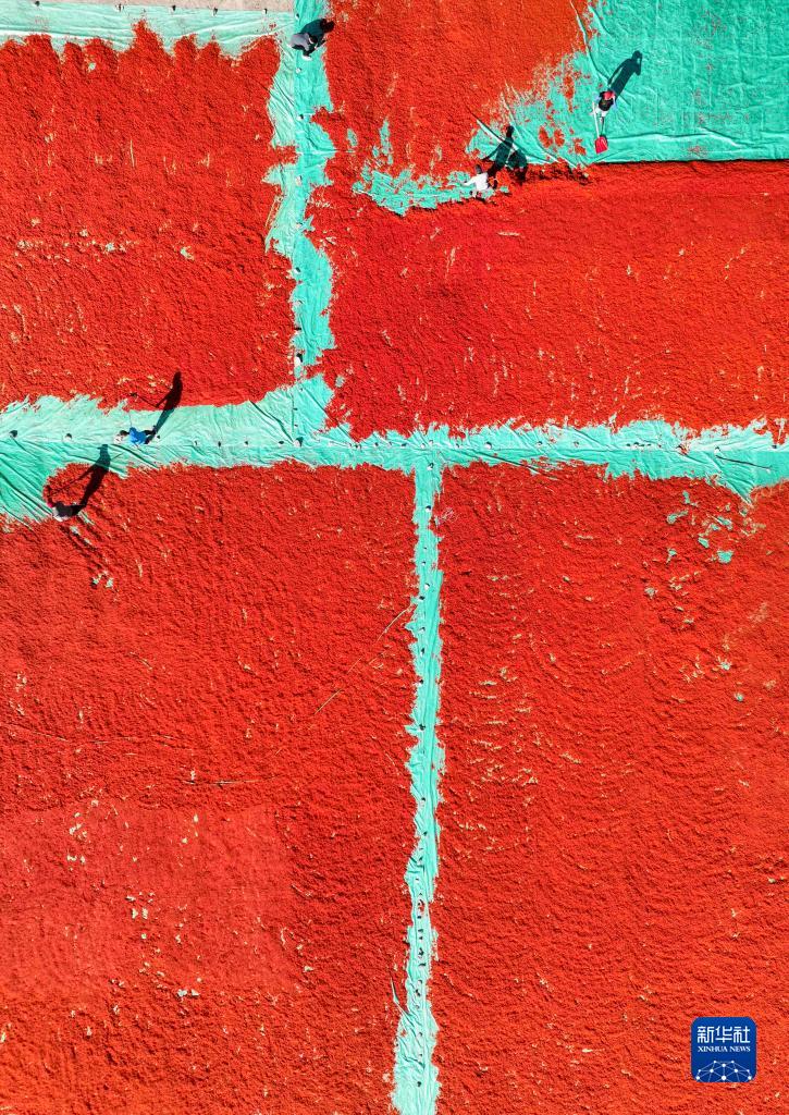 7月7日,新疆裕民縣江格斯鄉的村民在晾曬紅花絲(無(wú)人機照片)。