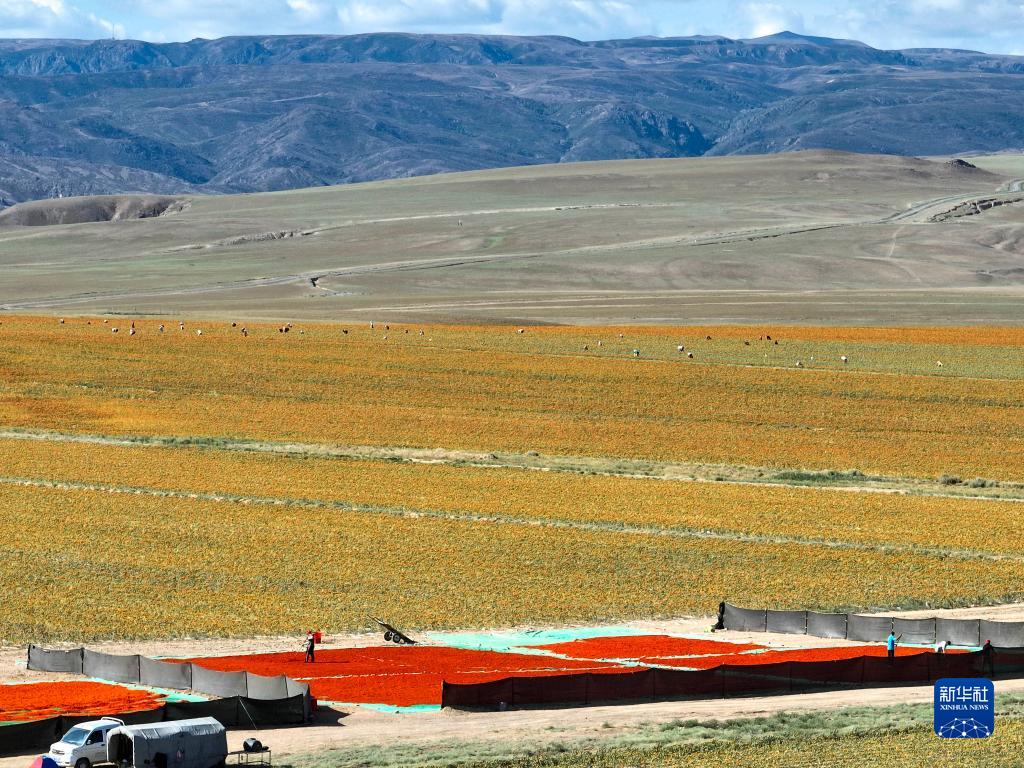 7月7日,采摘工人在新疆裕民縣江格斯鄉采收、晾曬紅花絲(無(wú)人機照片)。