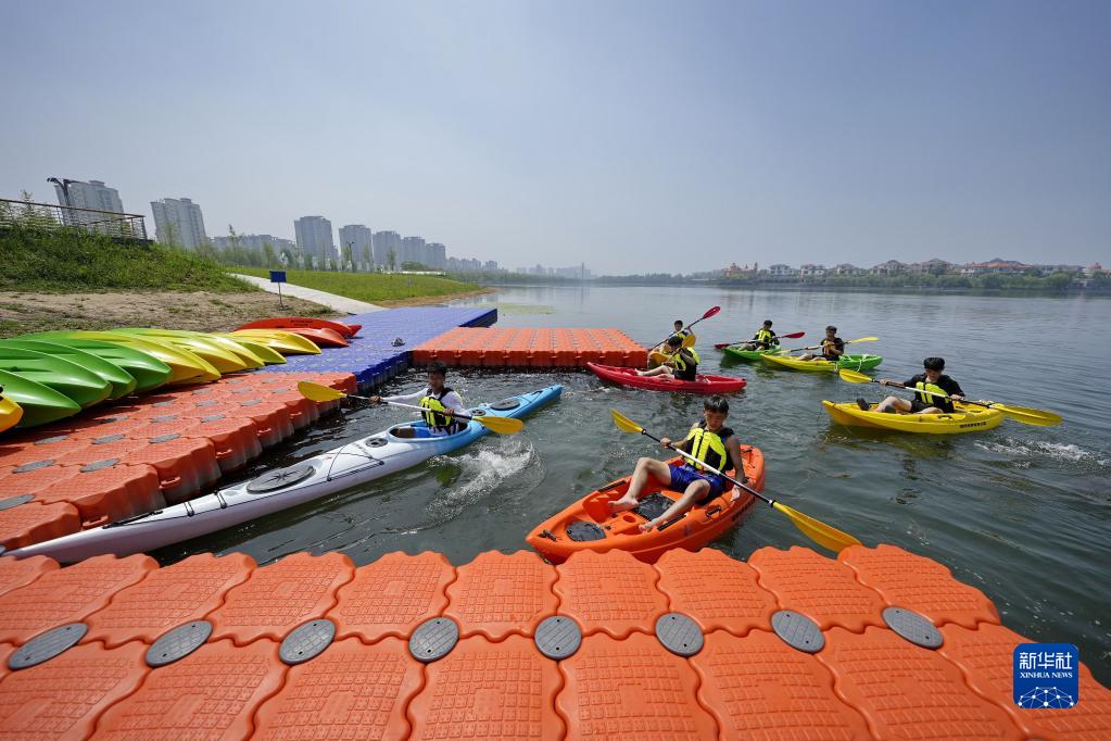 7月7日,學(xué)生在河北省遷安市灤河左岸體育公園練習皮劃艇。