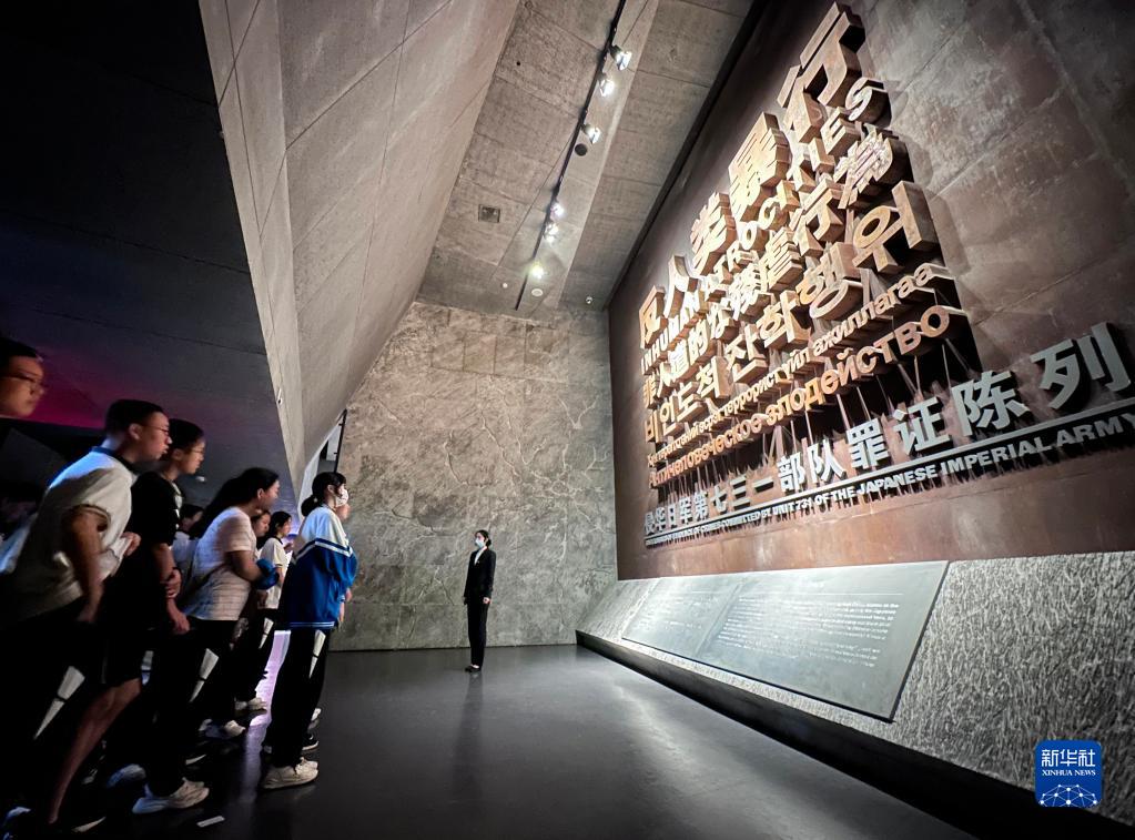 7月7日,在侵華日軍第七三一部隊罪證陳列館,參觀(guān)者參觀(guān)用六種語(yǔ)言寫(xiě)的“反人類(lèi)暴行”墻。