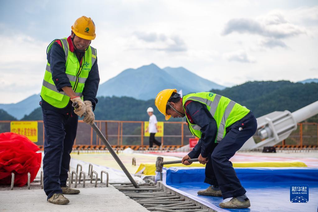 7月7日,在官新高速雪峰湖大橋施工現場(chǎng),工人在進(jìn)行橋面合龍施工。