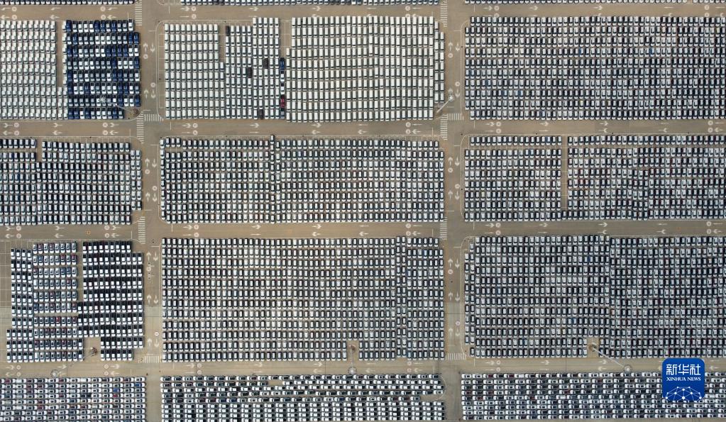 7月7日,在天津港海嘉滾裝碼頭,汽車(chē)排列整齊(無(wú)人機照片)。