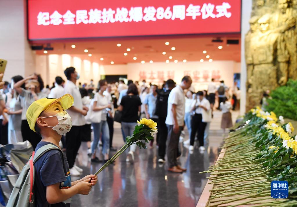 7月7日,一名小朋友在中國人民抗日戰爭紀念館向抗戰英烈獻花。