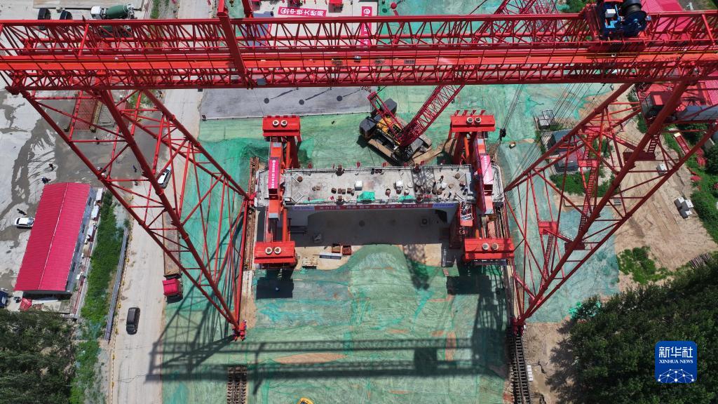 7月7日,在濟濱高鐵濟陽(yáng)黃河公鐵兩用特大橋建設現場(chǎng),中鐵大橋局的施工人員在架設鋼桁梁(無(wú)人機照片)。