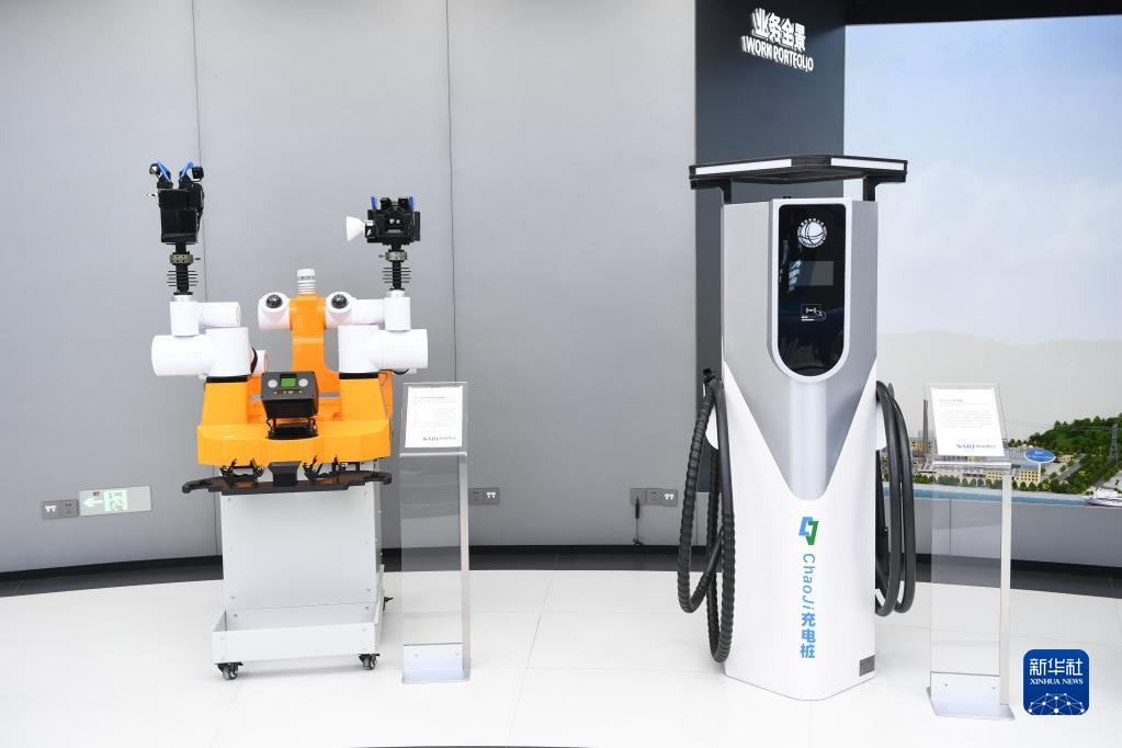 南瑞集團有限公司展廳內展示的充電樁和帶電作業(yè)機器人(7月7日攝)。
