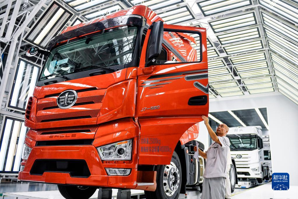 在位于吉林長(cháng)春的一汽解放J7智能工廠(chǎng)內,工作人員對裝配好的車(chē)輛進(jìn)行靜態(tài)檢查(6月27日攝)。