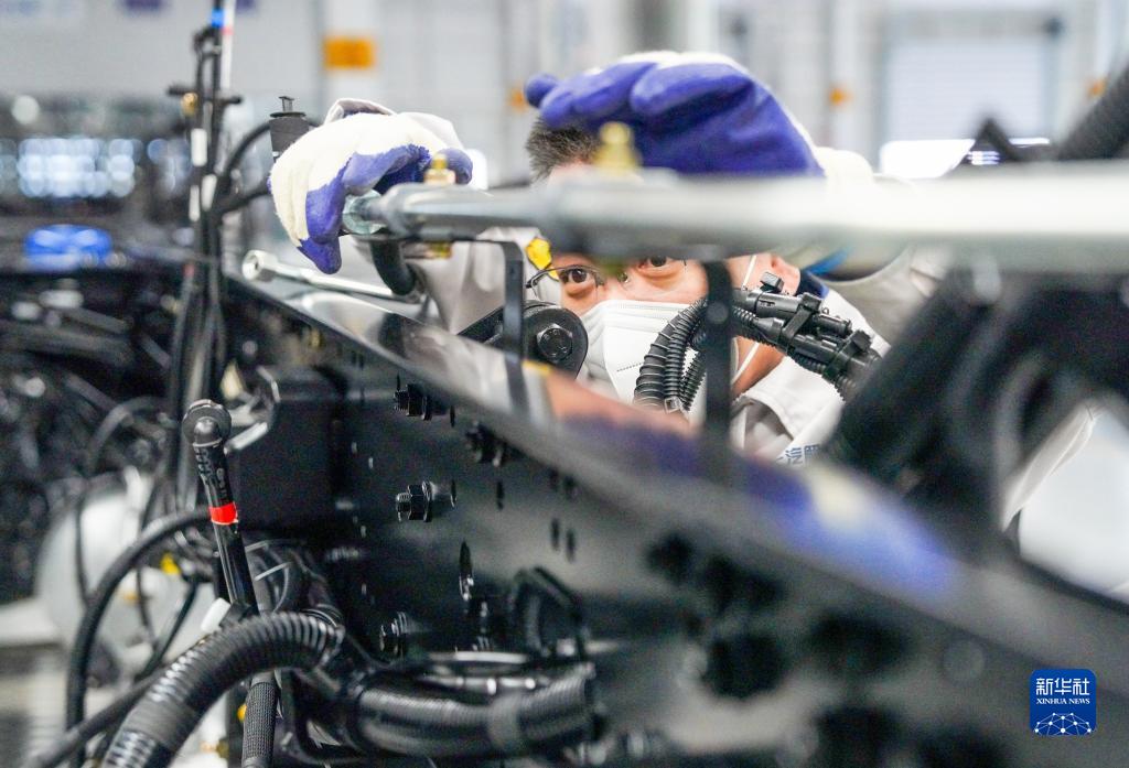 在位于吉林長(cháng)春的一汽解放J7智能工廠(chǎng)內,車(chē)間主任王一強在生產(chǎn)線(xiàn)上檢查汽車(chē)零部件(2022年12月27日攝)。