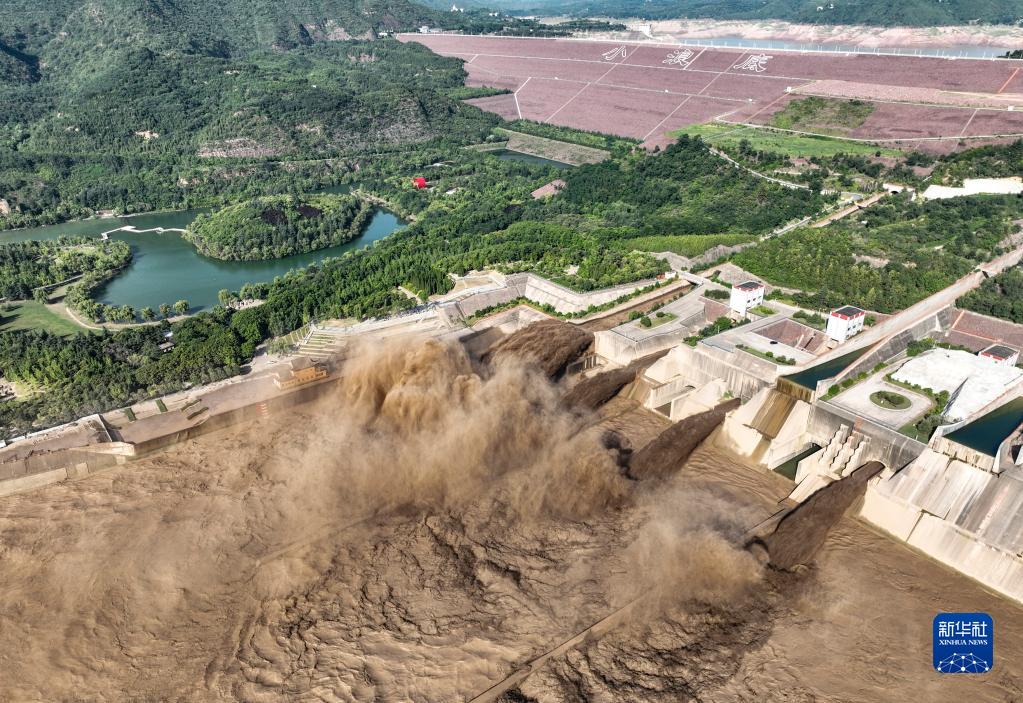 這是7月7日拍攝的黃河小浪底水庫排沙出庫場(chǎng)景(無(wú)人機照片)。