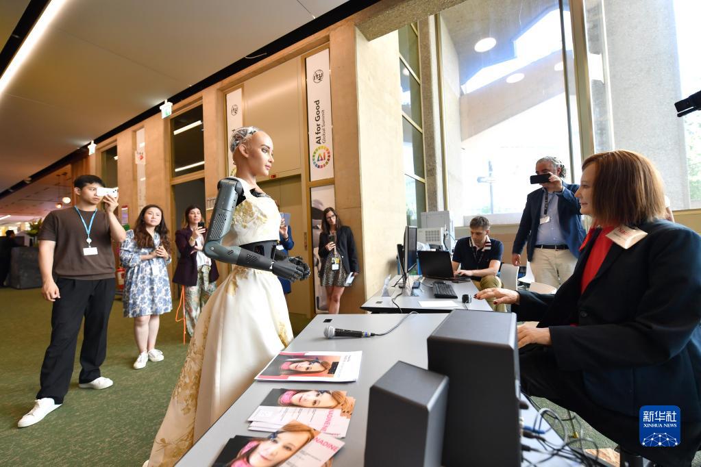 7月7日,在瑞士日內瓦“人工智能造福人類(lèi)全球峰會(huì )”上,仿真機器人索菲亞(左)和仿真機器人娜丁交談。