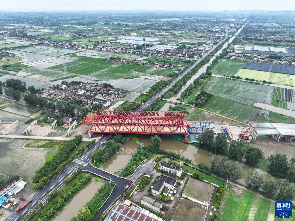 7月8日拍攝的常泰長(cháng)江大橋南北公路接線(xiàn)工程跨G345特大橋鋼桁梁頂推作業(yè)現場(chǎng)(無(wú)人機照片)。