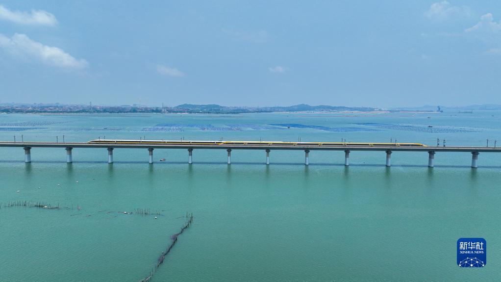 6月28日,在湄洲灣跨海大橋,試驗列車(chē)交會(huì )運行。國鐵集團在福廈高鐵福清至泉州區段組織開(kāi)展了新型動(dòng)車(chē)組新技術(shù)部件在更高運行速度條件下的性能驗證試驗,試驗列車(chē)單列最高運行時(shí)速達到453公里,標志著(zhù)CR450新一代動(dòng)車(chē)組研制取得新進(jìn)展。