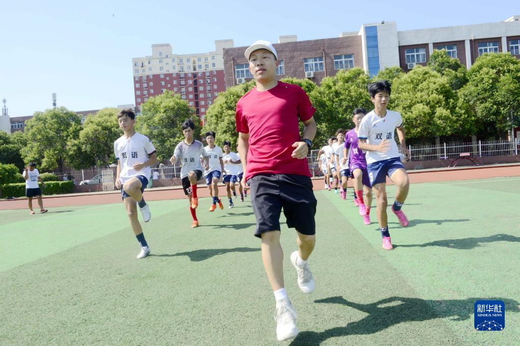 7月8日,在河南省駐馬店市汝南縣雙語(yǔ)學(xué)校,來(lái)自湖南大學(xué)的志愿者帶領(lǐng)孩子們一起做運動(dòng)。