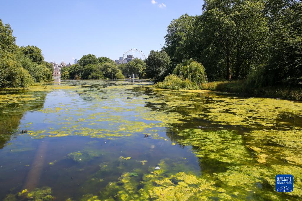 7月7日,由于氣溫升高,英國倫敦圣詹姆斯公園湖中綠藻泛濫。