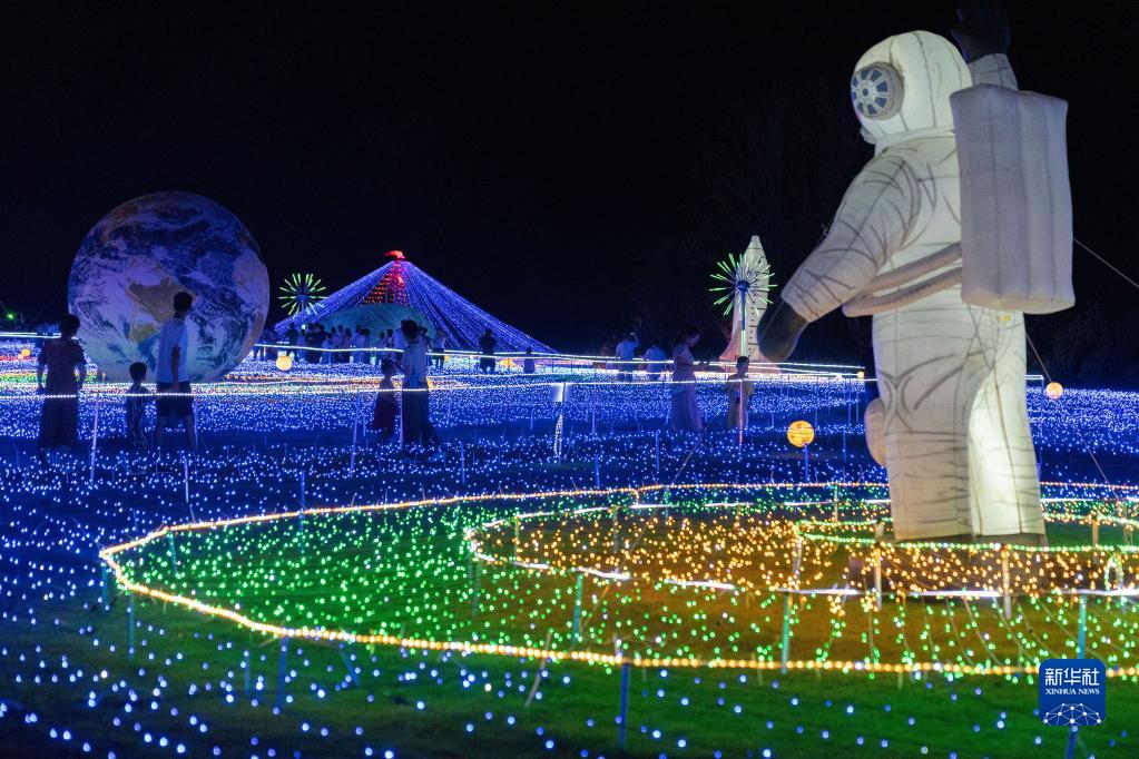 7月8日晚,安徽省合肥市肥東縣橋頭集鎮歡樂(lè )森林景區,人們在欣賞燈展。