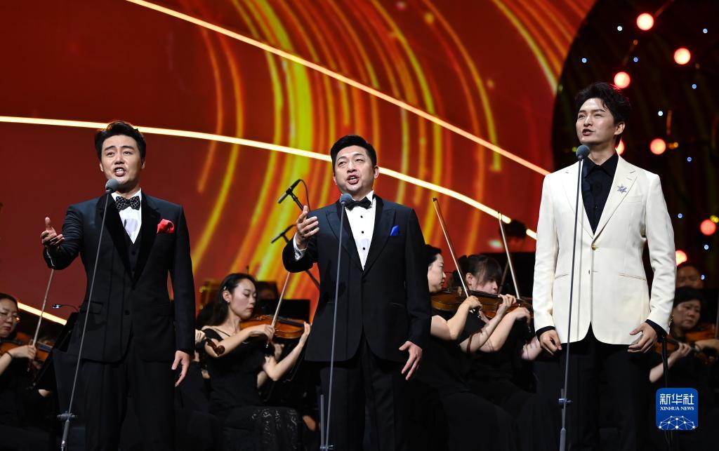 7月8日,在西安“感悟初心?與黨同行”經(jīng)典歌曲交響音樂(lè )會(huì )現場(chǎng),演唱者田彥(中)、張英席(左)、王凱在演唱歌曲《新的天地》。