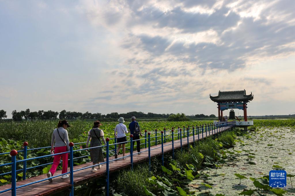 7月9日,在白云湖國家濕地公園內,游客在觀(guān)賞荷花。