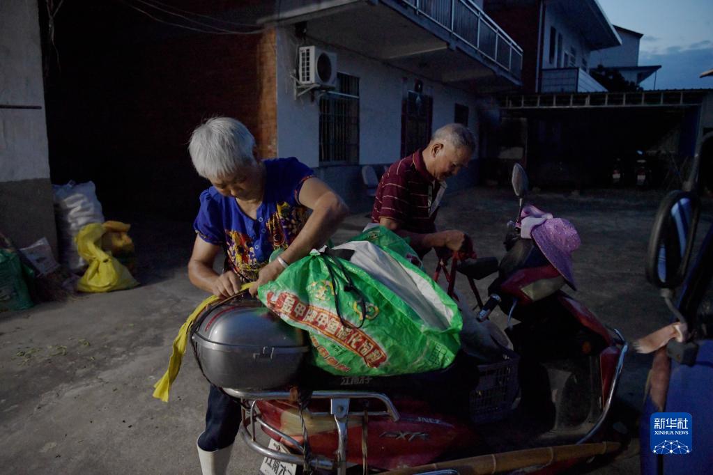 凌晨5時(shí),在江西南昌縣向塘鎮浹溪村,菜農余春蘭(左)將整理好的蔬菜固定在摩托車(chē)上準備騎車(chē)去趕公交車(chē)(7月5日攝)。