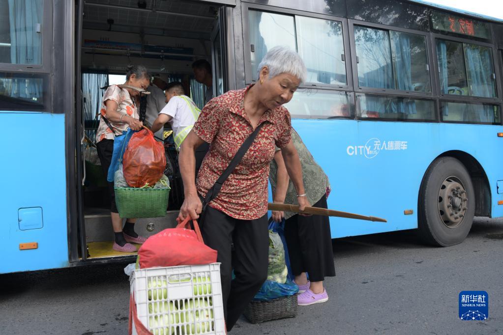 菜農余春蘭到站下車(chē),準備前去賣(mài)菜(7月5日攝)。