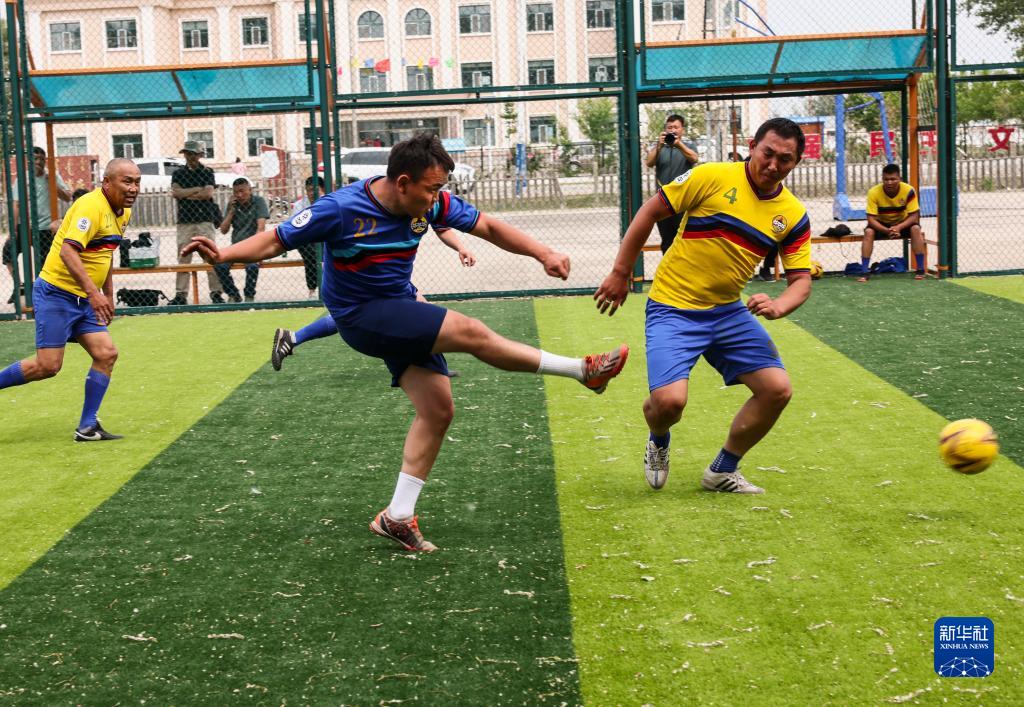 6月27日,在錫尼河鎮組織的一場(chǎng)友誼賽中,巴達瑪斯仁(前右二)在場(chǎng)上射門(mén)。