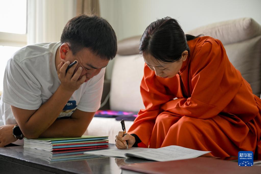 7月2日,巴達瑪斯仁(左)在妻子烏日汗的幫助下學(xué)習。今年6月,巴達瑪斯仁與烏日汗結婚,并積極準備公務(wù)員考試。