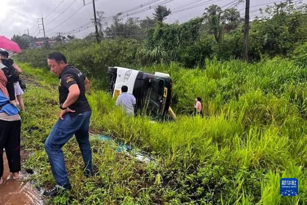 這是7月9日在泰國羅勇府拍攝的客車(chē)側翻事故現場(chǎng)(手機拍攝)。