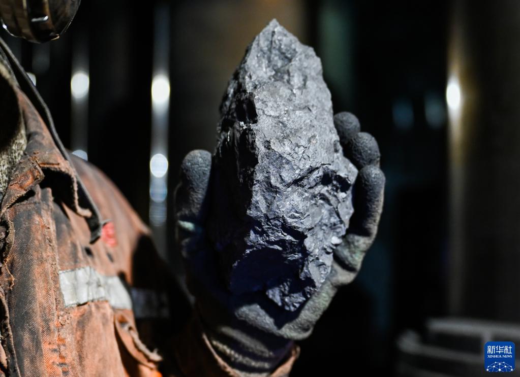 7月8日,在大唐龍王溝煤礦井下近400米的作業(yè)面上,一名工人在展示一塊煤炭。