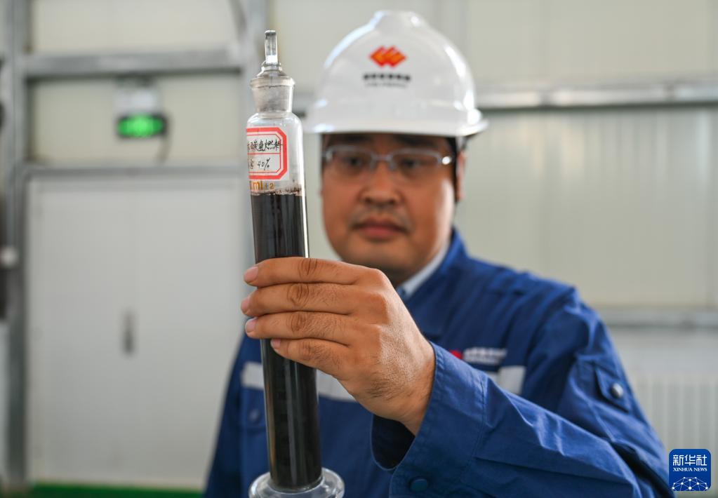 7月7日,國能準能集團煤基納米碳氫燃料車(chē)間主任甄鵬在展示該燃料的樣品。
