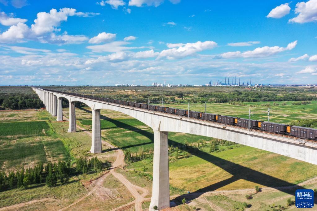 這是在準格爾旗境內拍攝的運煤專(zhuān)列(7月8日攝,無(wú)人機照片)。