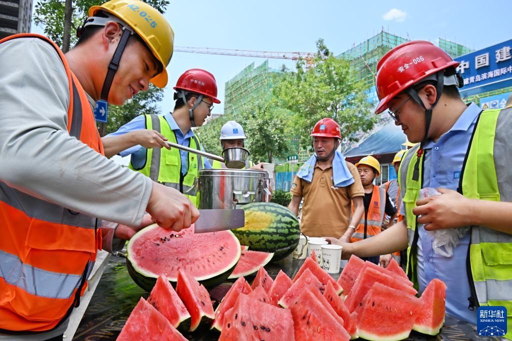 7月10日,中建二局青島濱海國際中心項目部的工人在休息站領(lǐng)取防暑降溫食品。
