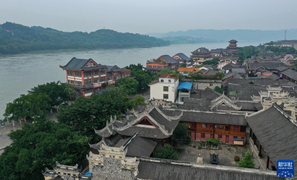 這是2022年6月22日在四川省宜賓市長(cháng)江邊拍攝的李莊古鎮(無(wú)人機照片)。