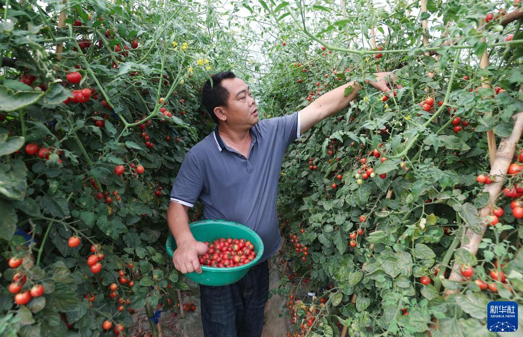 一位村民在四川省宜賓市南溪區長(cháng)江村的“菜稻菜”蔬菜示范基地里采摘水果西紅柿(6月29日攝)。