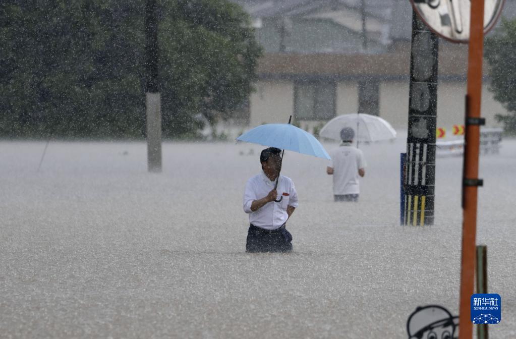 7月10日,行人在日本福岡縣久留米市積水的路上行走。